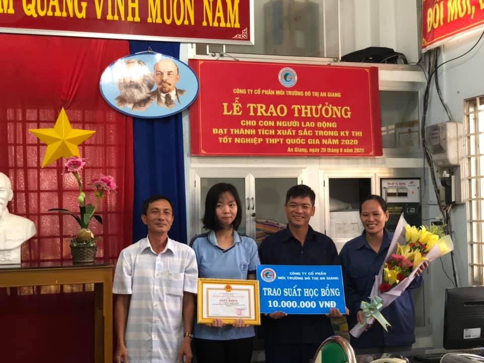 Công ty Cổ phần Môi trường đô thị An Giang trao học bổng cho cháu Dương Ngọc Trâm là con của công nhân Xí nghiệp