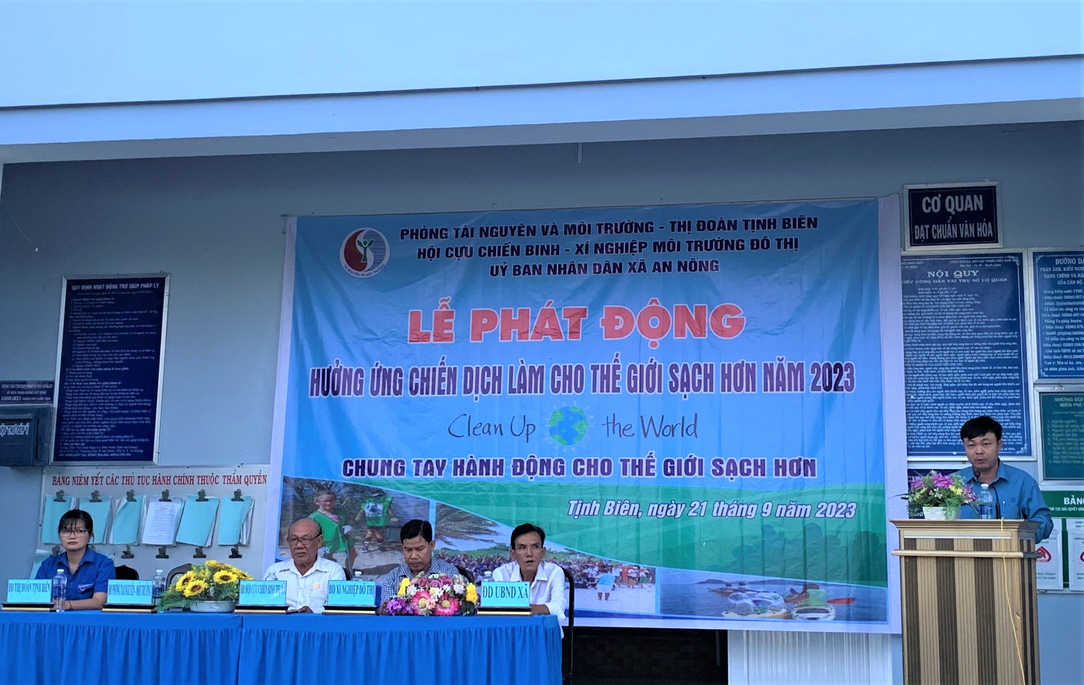 Ngày 21/9, Phòng Tài nguyên và Môi trường thị xã Tịnh Biên phối hợp Thị đoàn, Hội Cựu chiến binh, Xí nghiệp Môi trường đô thị Tịnh Biên và UBND xã An Nông tổ chức lễ phát động hưởng ứng chiến dịch tổng vệ sinh môi trường với chủ đề “Chung tay hành động cho thế giới sạch hơn” năm 2023.