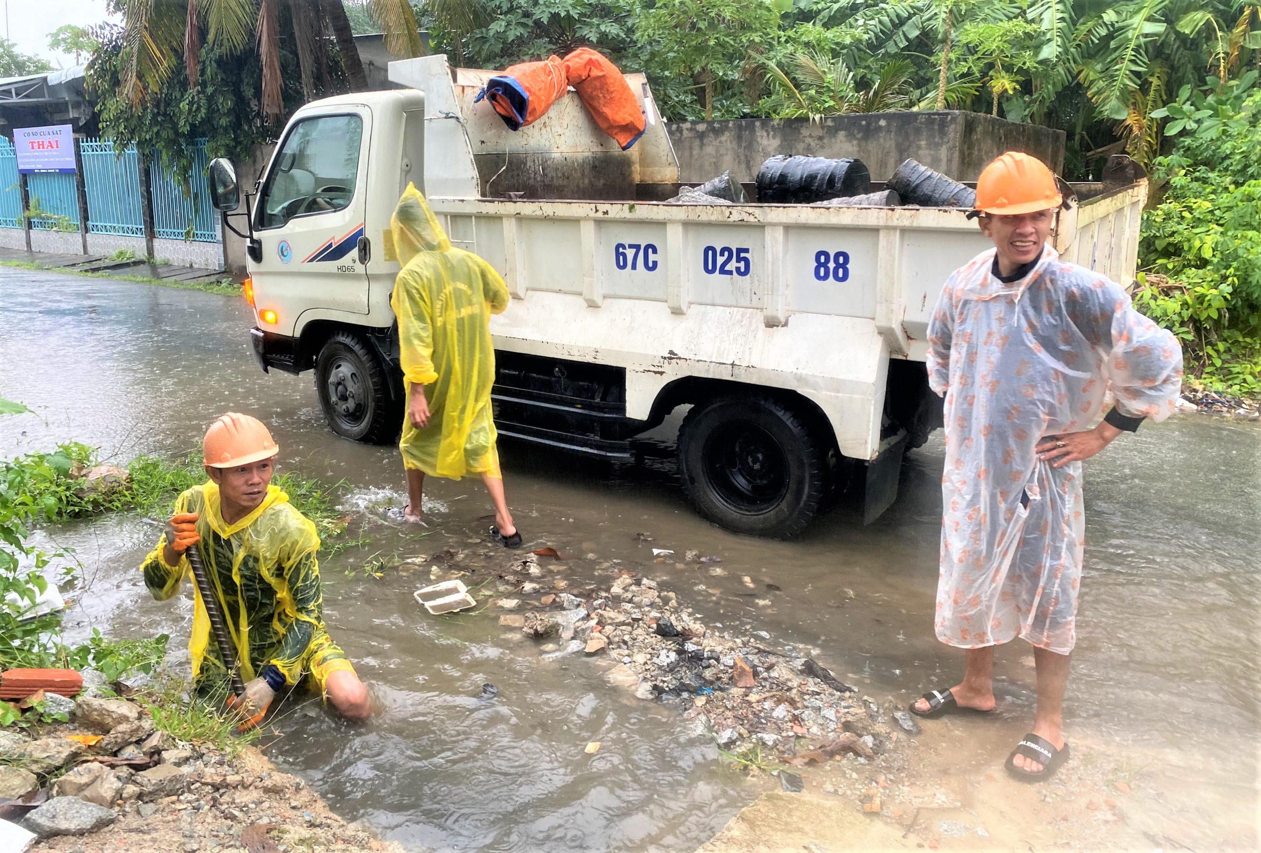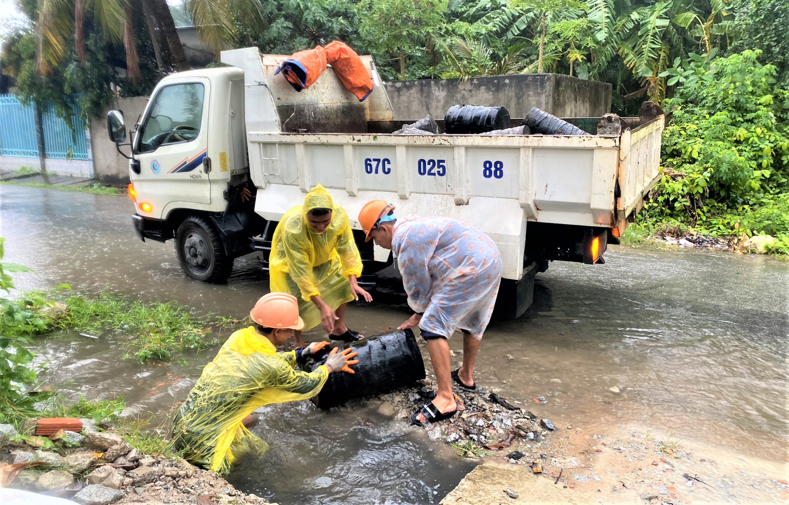 Một số hình ảnh công nhân môi trường trầm mình trong trận mưa tầm tã và dưới mương nước để khai thông dòng chảy dọc theo tuyến đường Ngô Quyền và Trần Phú:
