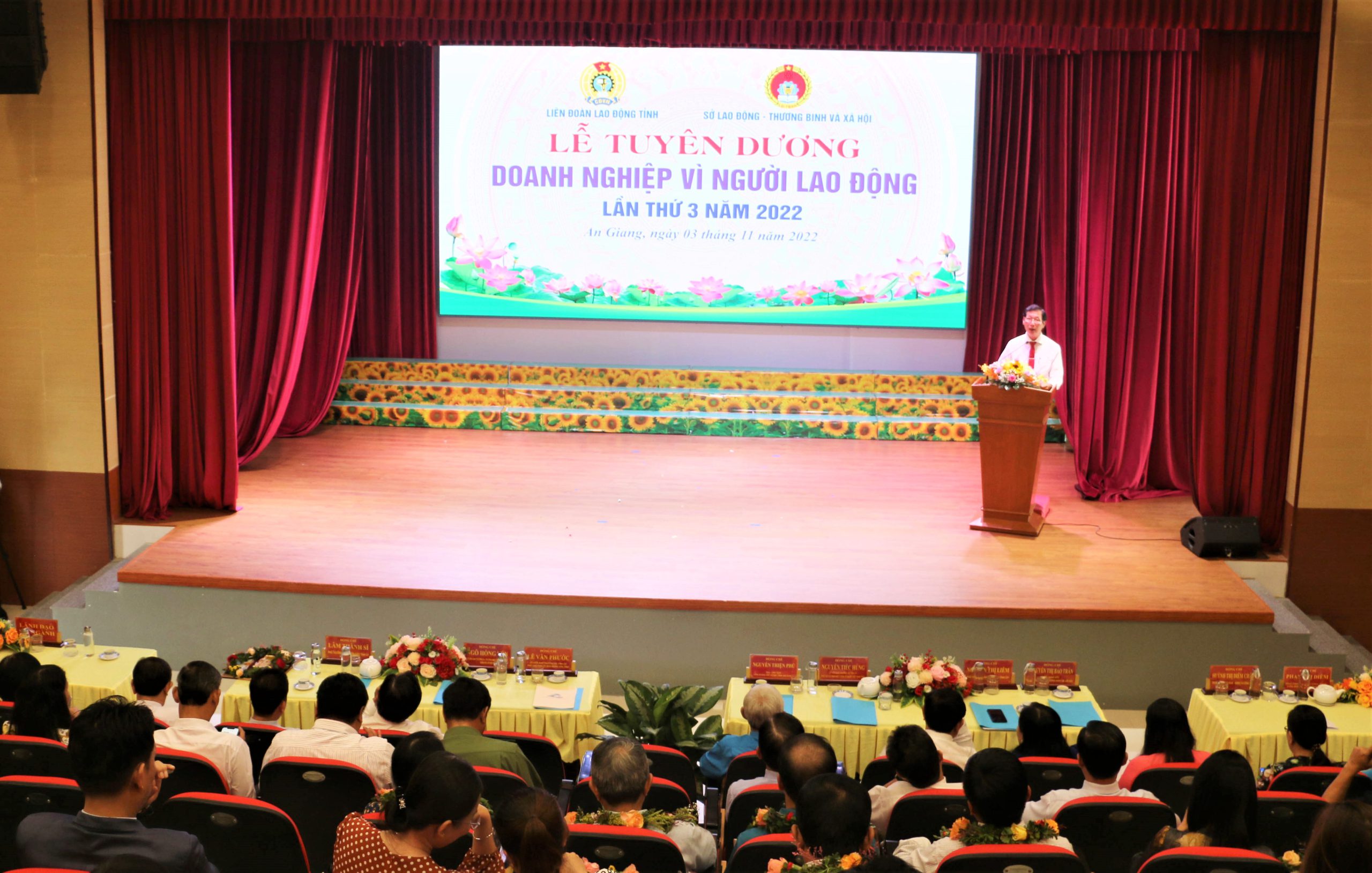 Ngày 3/11, Liên đoàn Lao động (LĐLĐ) tỉnh An Giang phối hợp Sở Lao động, Thương binh và Xã hội (LĐ-TB&XH) tỉnh tổ chức lễ tuyên dương “Doanh nghiệp vì người lao động” năm 2022. Phó Chủ tịch UBND tỉnh An Giang Lê Văn Phước, Chủ tịch UBMTTQ Việt Nam tỉnh An Giang Nguyễn Tiếc Hùng, Trưởng Ban Tổ chức Tỉnh ủy – Giám đốc Sở Nội vụ tỉnh Ngô Hồng Yến cùng lãnh đạo các sở, ban, ngành tỉnh tham dự.Lãnh đạo UBND tỉnh An Giang chúc mừng các doanh nghiệp được tuyên dương “Doanh nghiệp vì người lao động” năm 2022.