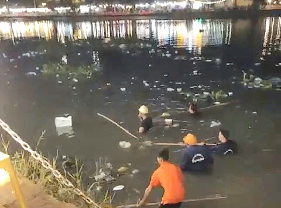 Nhiều công nhân được giao nhiệm vụ vớt rác dưới mé sông ngay trong đêm giao thừa để đảm bảo môi trường sạch đẹp.
