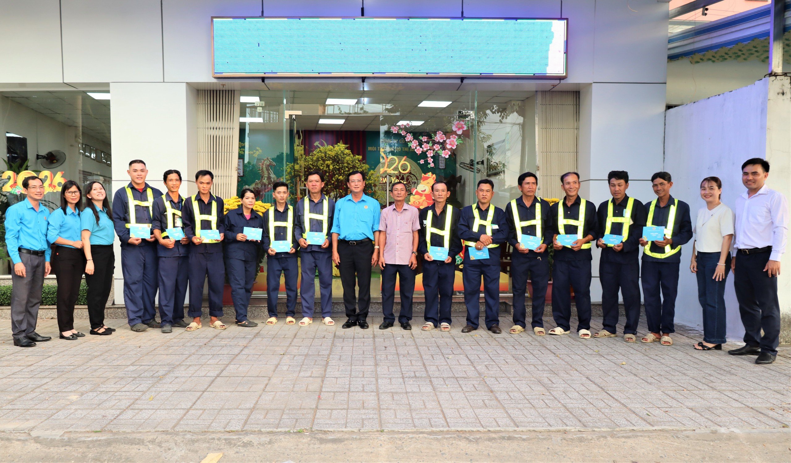 Bí thư Đảng ủy phường Long Xuyên cùng đoàn công tác đến thăm hỏi, tặng quà nhằm động viên tinh thần cho công nhân môi trường làm phải làm việc trong đêm giao thừa để đường phố luôn sạch đẹp