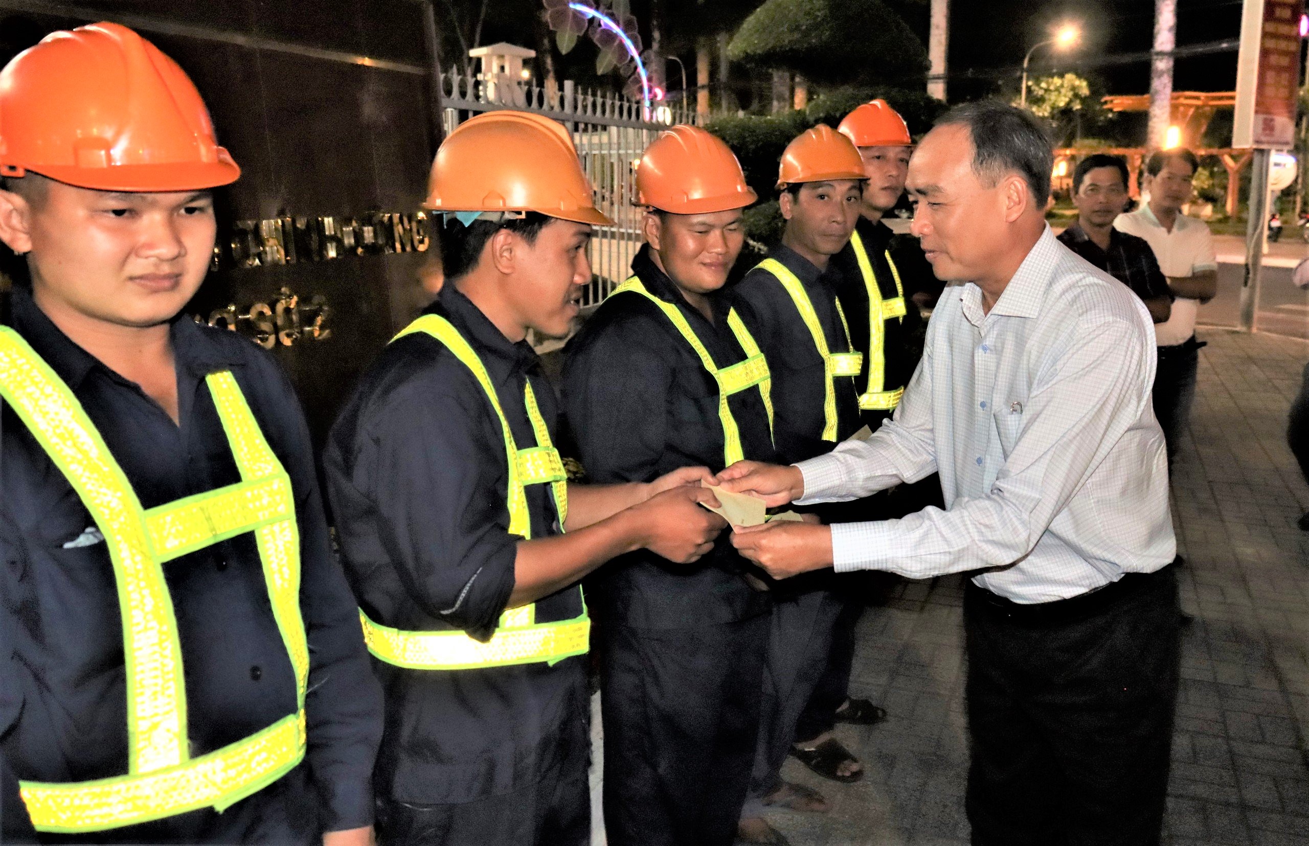 Phó Chủ tịch Liên đoàn Lao động tỉnh An Giang Nguyễn Nhật Tiến đến thăm hỏi, động viên công nhân môi trường trước khi mọi người bắt tay vào công việc tổng vệ sinh môi trường trong đêm giao thừa.