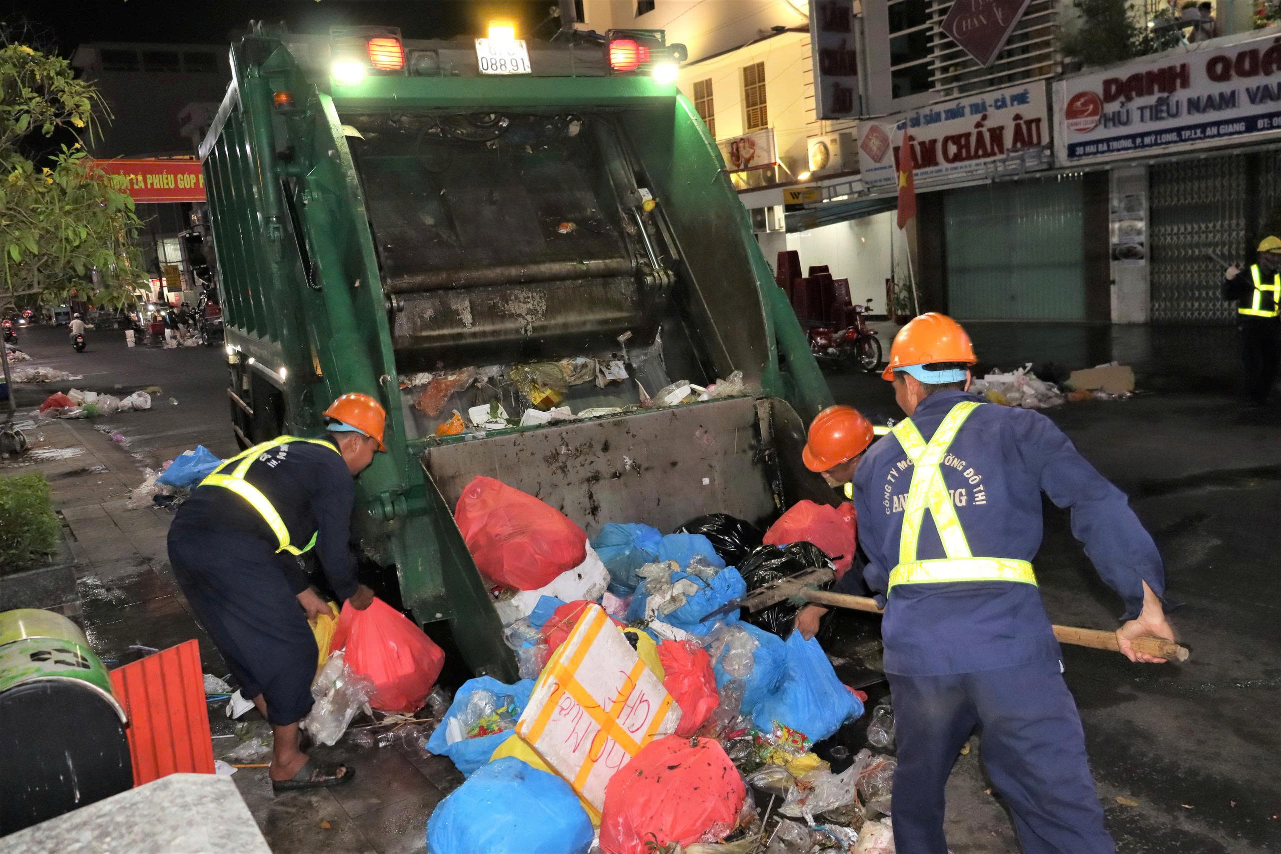 Ngay sau buổi lễ ra quân, có hơn 300 công nhân thuộc Đội Thoát nước, chăm sóc công viên, cây xanh được huy động cùng lực lượng thuộc Đội Vệ sinh toả ra khắp các nẻo đường trên toàn địa bàn các phường Long Xuyên, Bình Đức, Mỹ Thới và xã Mỹ Hoà Hưng để thực hiện công việc quét và thu gom rác. Một số công nhân quen leo trèo, chăm sóc công viên, cây xanh thì nay được giao nhiệm vụ vớt rác dọc theo tuyến bờ kè đường Bùi Văn Danh (phường Long Xuyên). Mặc dù phải trầm mình dưới nước lạnh trong đêm nhưng tất cả công nhân đều tỏ ra phấn khởi vì bản thân góp phần cho quê hương mình thêm sạch đẹp từ trên đường đến dưới sông sâu. Trong khi đó, hàng trăm công nhân khác vẫn miệt mài quét rác trên các tuyến đường hoặc thu gom rác trước nhà dân trước khi đưa đến các bãi tập kết tạm là những khoảng đất trống xa khu dân dư để hạn chế tối đa mùi hôi từ rác thải. Tất cả lượng rác phát sinh khổng lồ này sẽ được nhanh chóng đưa về khu xử lý rác theo quy định.