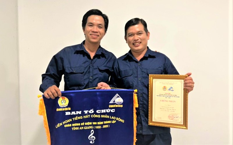 Trong khi đó, 2 công nhân tổ điện thuộc Xí nghiệp Môi trường đô thị TP. Châu Đốc là Đoàn Văn Thạnh và Nguyễn Ngọc Ẩn cũng xuất sắc đoạt giải nhất tốp ca với tiết mục “Xin chào, xin chào” của nghệ sĩ Quốc Thiện. Với kết quả này, các công nhân thuộc Xí nghiệp Môi trường đô thị huyện Tịnh Biên và TP. Châu Đốc được chọn công diễn trong đêm tổng kết, trao giải tại Liên hoan Tiếng hát công nhân lao động năm 2022.