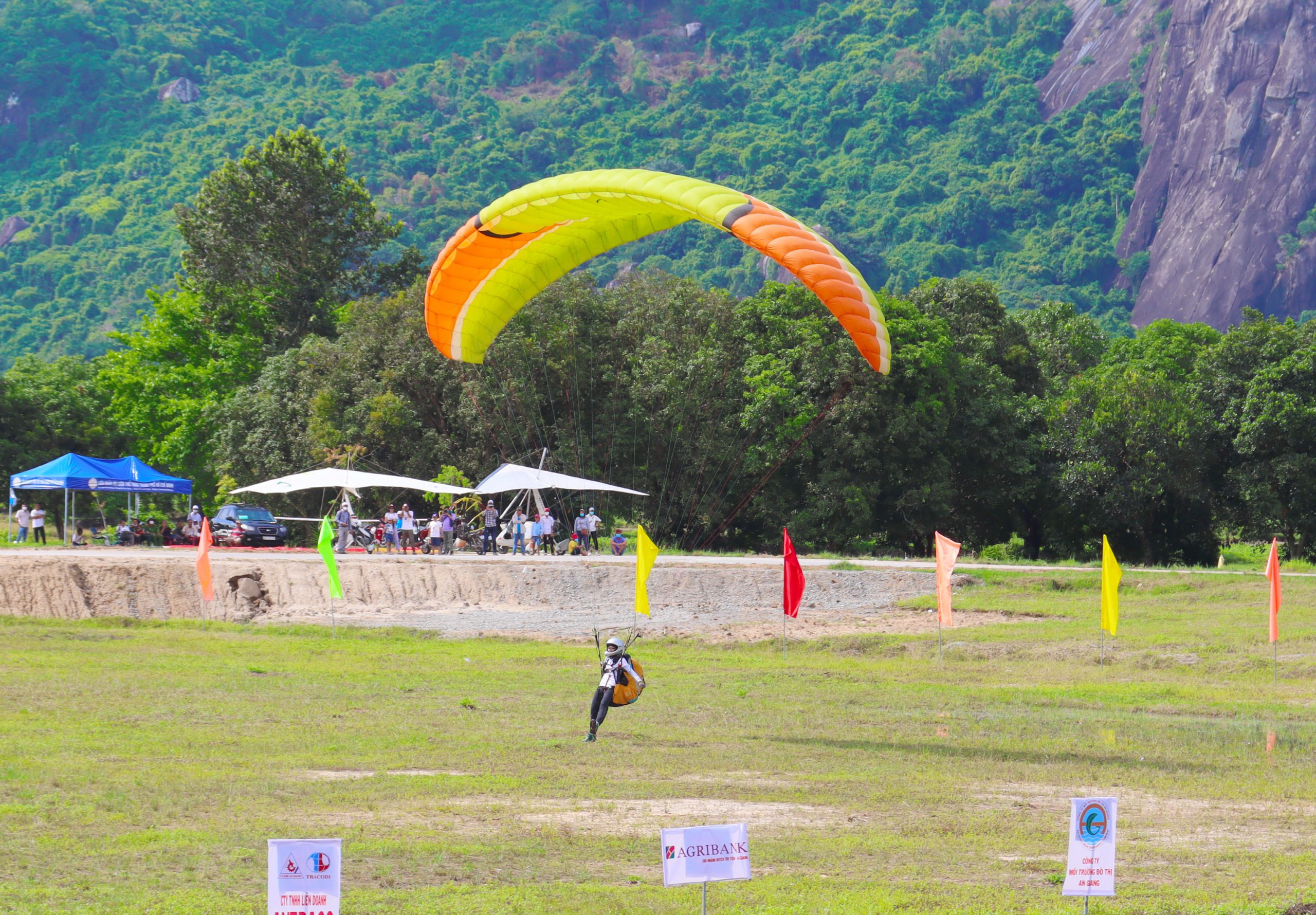 Một nữ phi công dù lượn đáp xuống mặt đất thành công trong tiếng hò reo cổ vũ của hàng ngàn khán giả trên sân.