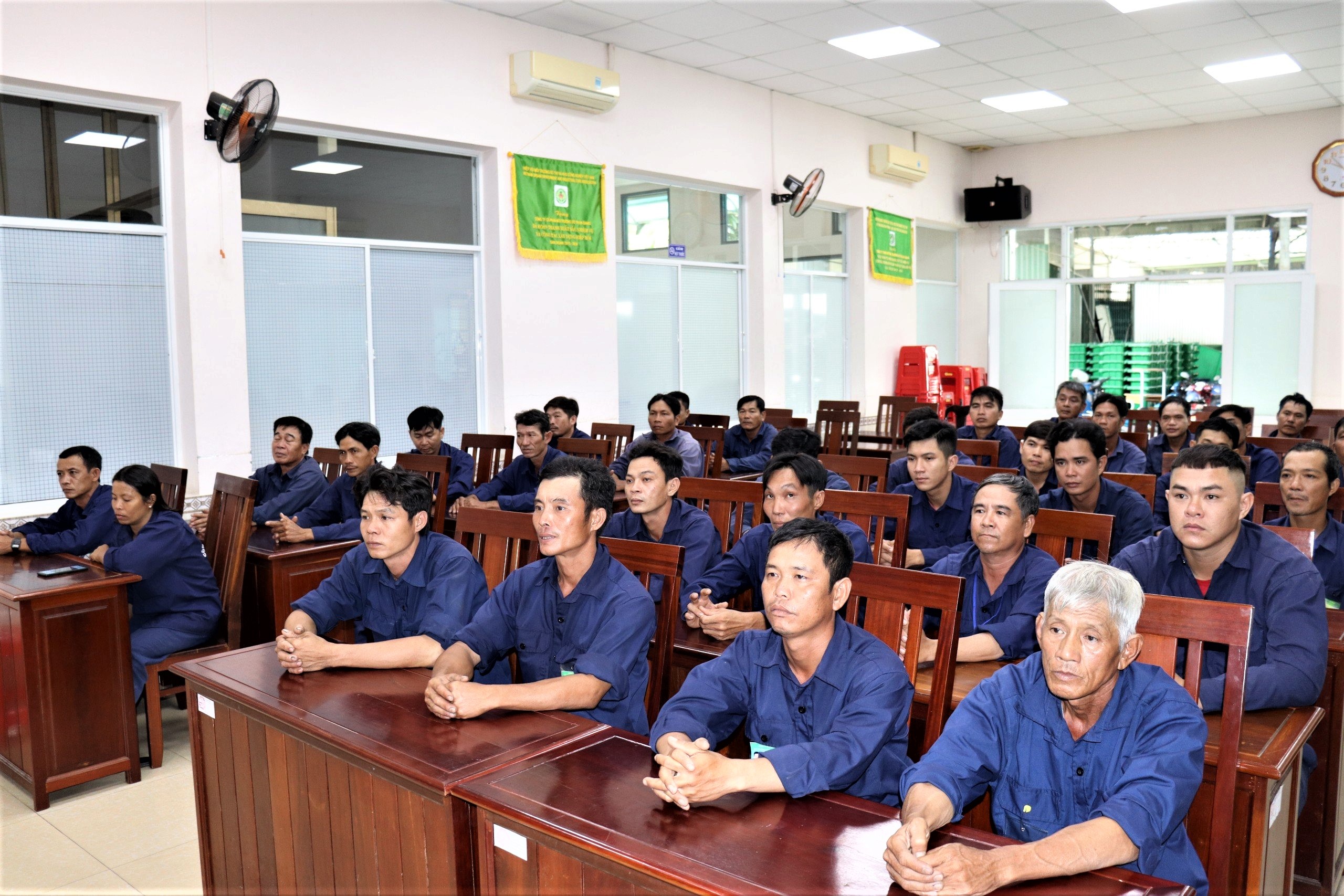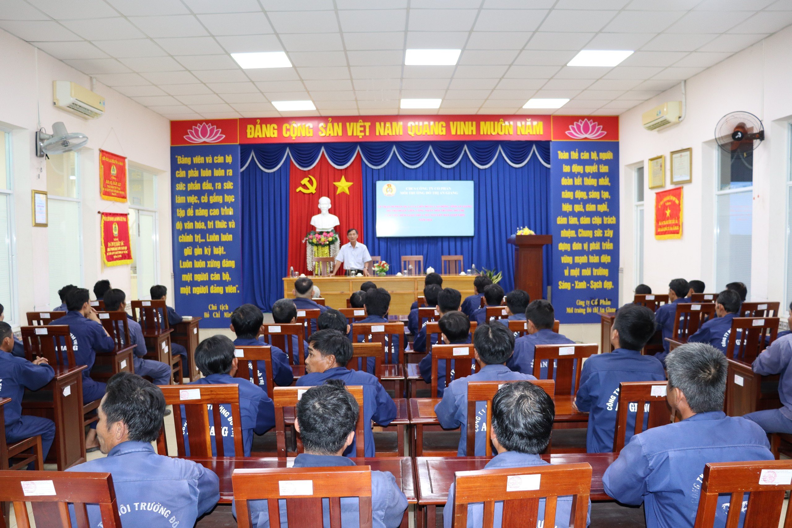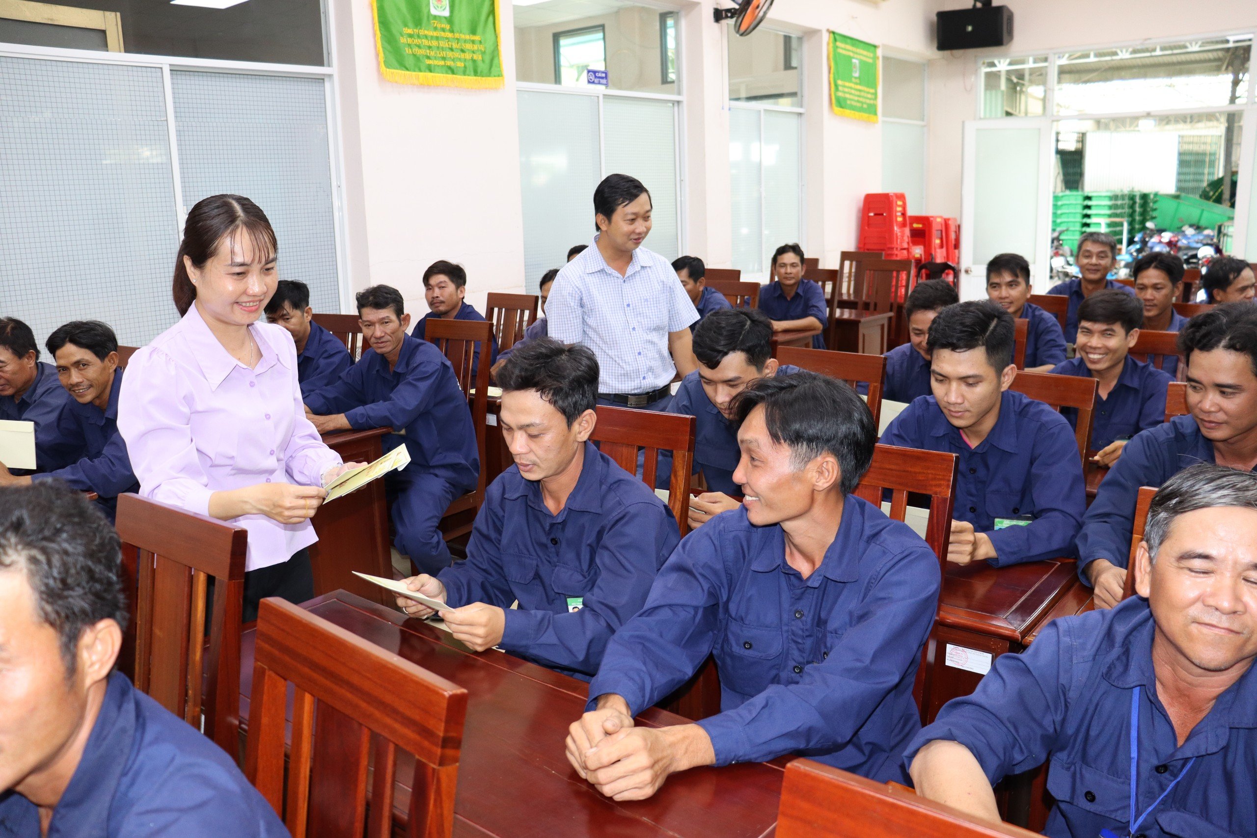 Các công nhân được nghe lãnh đạo Công ty Cổ phần Môi trường đô thị An Giang phổ biến về ý nghĩa của những suất quà do Liên đoàn Lao động tỉnh An Giang hỗ trợ.