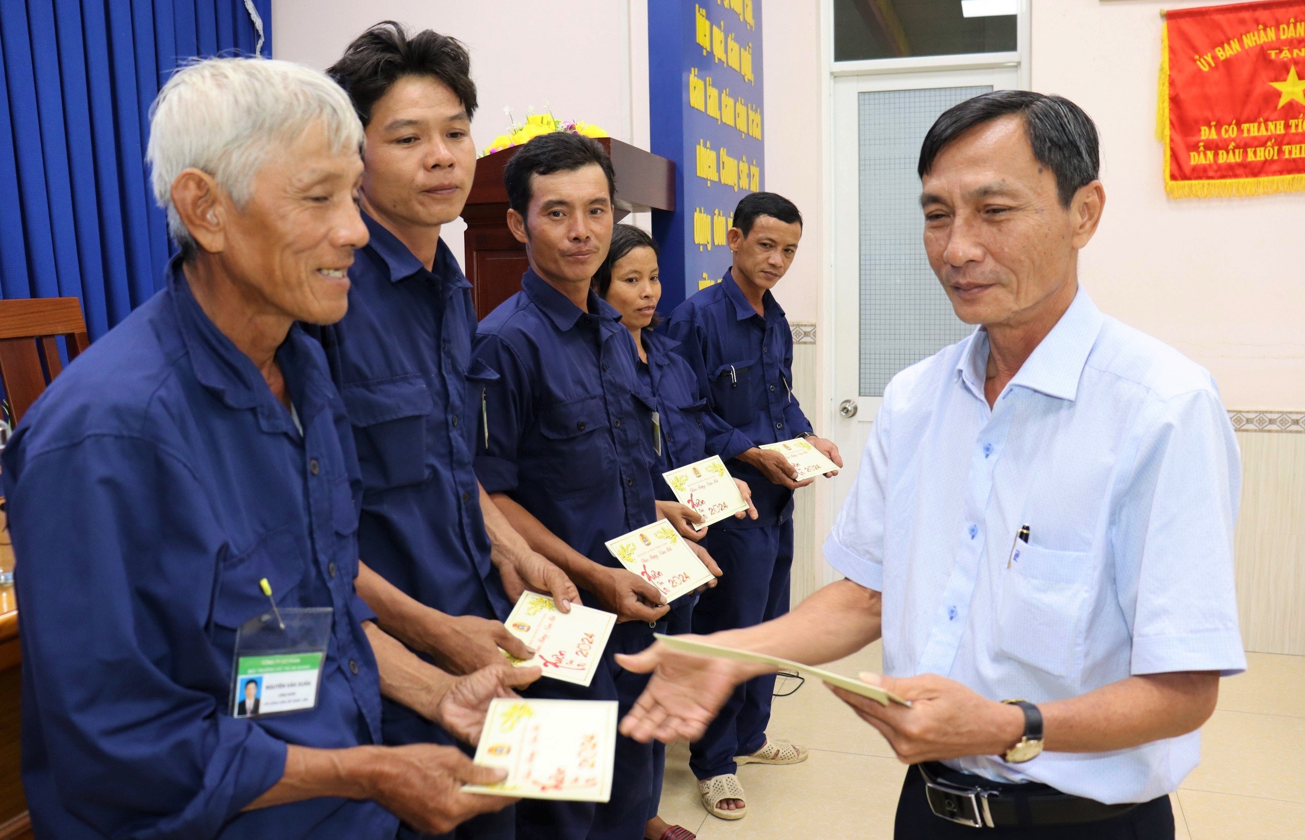 Phó Tổng Giám đốc, Chủ tịch Công đoàn cơ sở Công ty Cổ phần Môi trường đô thị An Giang Đặng Anh Dũng trao quà hỗ trợ cho công nhân làm việc trong đêm giao thừa Tết Nguyên đán vừa qua.