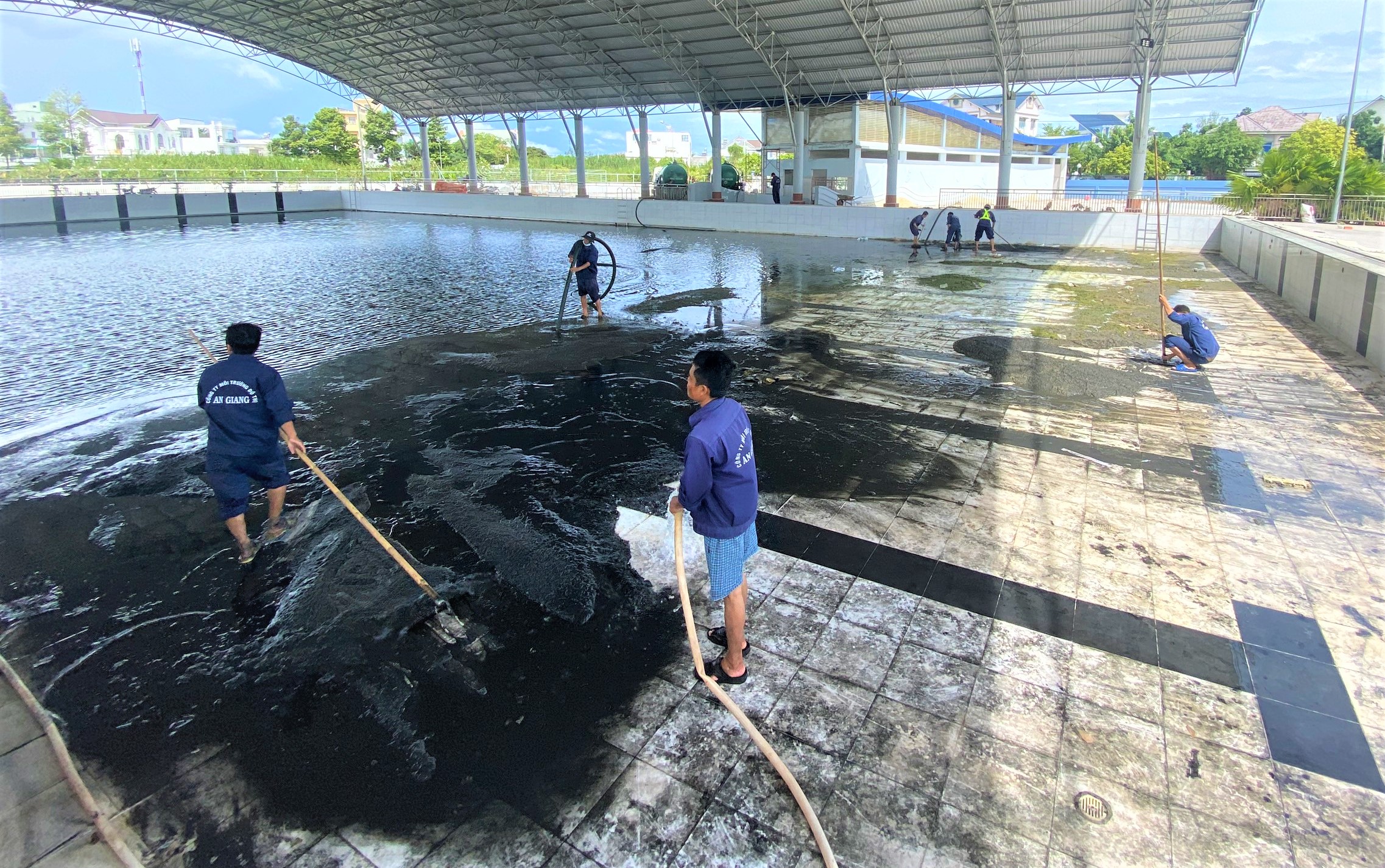 Các công nhân phải cạo sạch lớp rong rêu và bùn lắng lâu ngày trong lòng hồ bơi rồi dùng máy hút đưa lên xe chuyên dùng vận chuyển đến nơi xử lý.