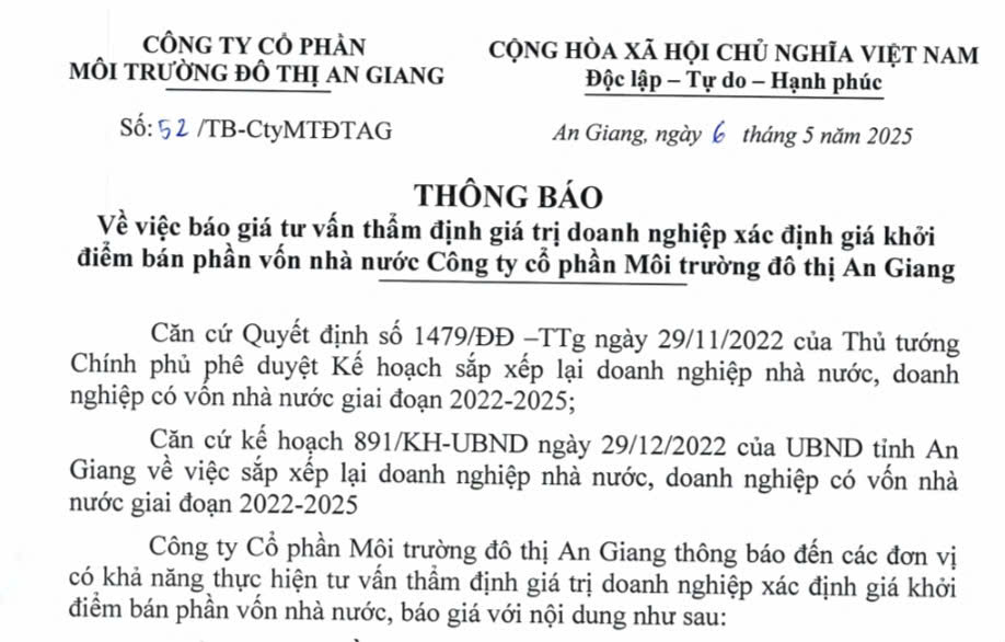 Thông báo thay đổi thông tin Công ty Cổ phần Môi trường đô thị An Giang