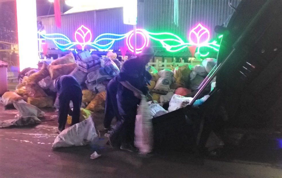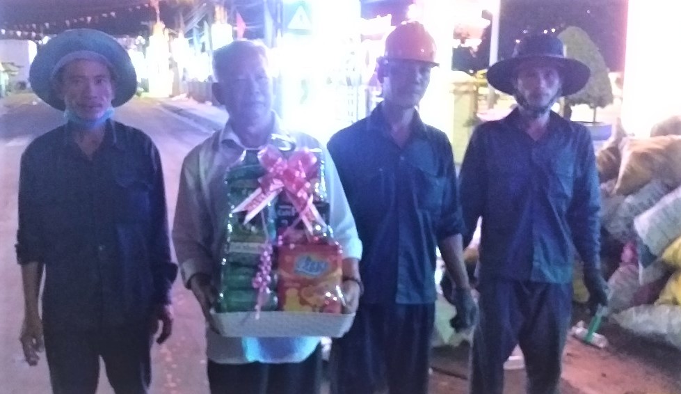 Các công nhân phải thay phiên nhau làm việc ban đêm để đảm bảo thu gom rác được thuận tiện hơn nên được đại diện Ban trị sự Phật Giáo Hoà Hảo tặng quà động viên tinh thần.